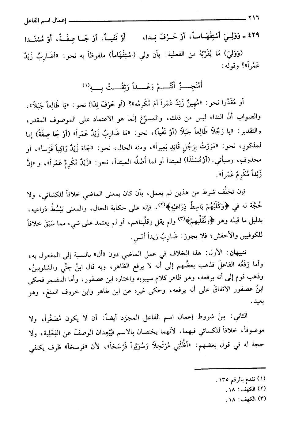 فإن تخلف شرط من هذين لم يعمل، بأن كان بمعنى الماضي خلافًا للكسائي، ولا حجة له في {وَكَلْبُهُمْ بَاسِطٌ ذِرَاعَيْه} 2، فإنه على حكاية الحال، والمعنى يبسط ذراعيه، بدليل ما قبله وهو {وَنُقَلِّبُهُمْ} 3 ولم يقل وقلبناهم، أو لم يعتمد على شيء مما سبق خلافًا للكوفيين والأخفش؛ فلا يجوز: ضاربٌ زيدًا أمسِ.