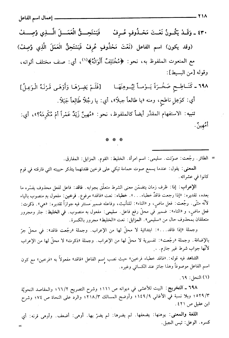 الشاهد فيه قوله: "فاقد خطباء فرخين" حيث نصب اسم الفاعل "فاقد" مفعولًا به "فرخين" مع كون اسم الفاعل موصوفًا وهذا جائز عند الكسائي وغيره.