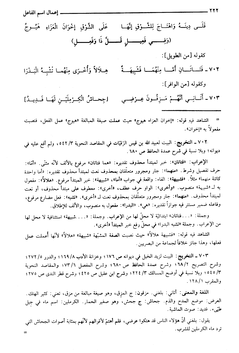 703- التخريج: البيت لعبيد الله بن قيس الرقيات في المقاصد النحوية 3/ 542، ولم أقع عليه في ديوانه؛ وبلا نسبة في شرح عمدة الحافظ ص680.