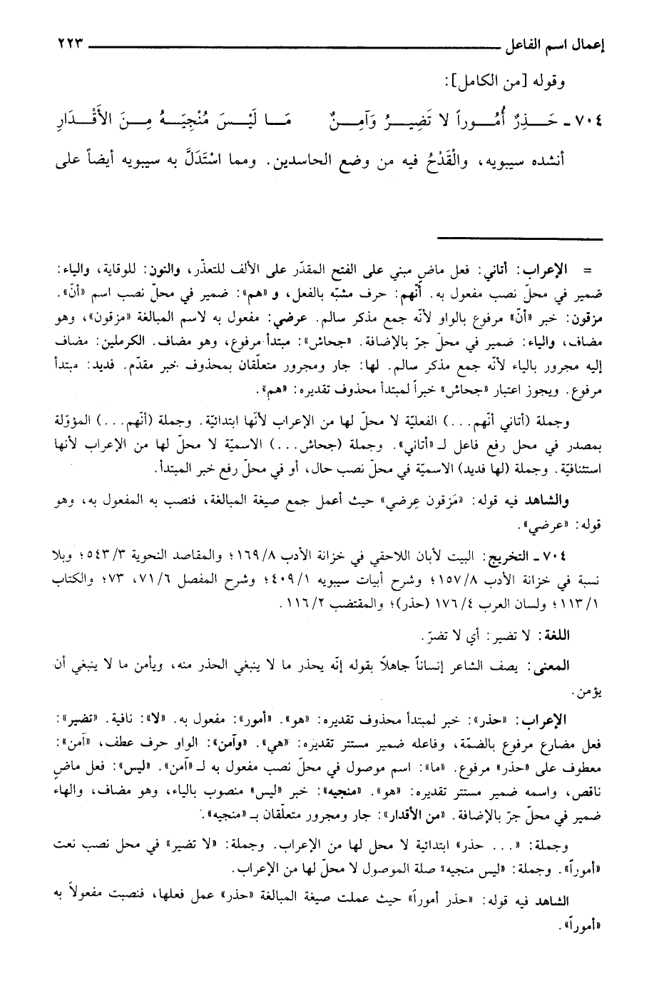 704- التخريج: البيت لأبان اللاحقي في خزانة الأدب 8/ 169؛ والمقاصد النحوية 3/ 543؛ وبلا نسبة في خزانة الأدب 8/ 157؛ وشرح أبيات سيبويه 1/ 409؛ وشرح المفصل 6/ 71، 73؛ والكتاب 1/ 113؛ ولسان العرب 4/ 176 "حذر"؛ والمقتضب 2/ 116.