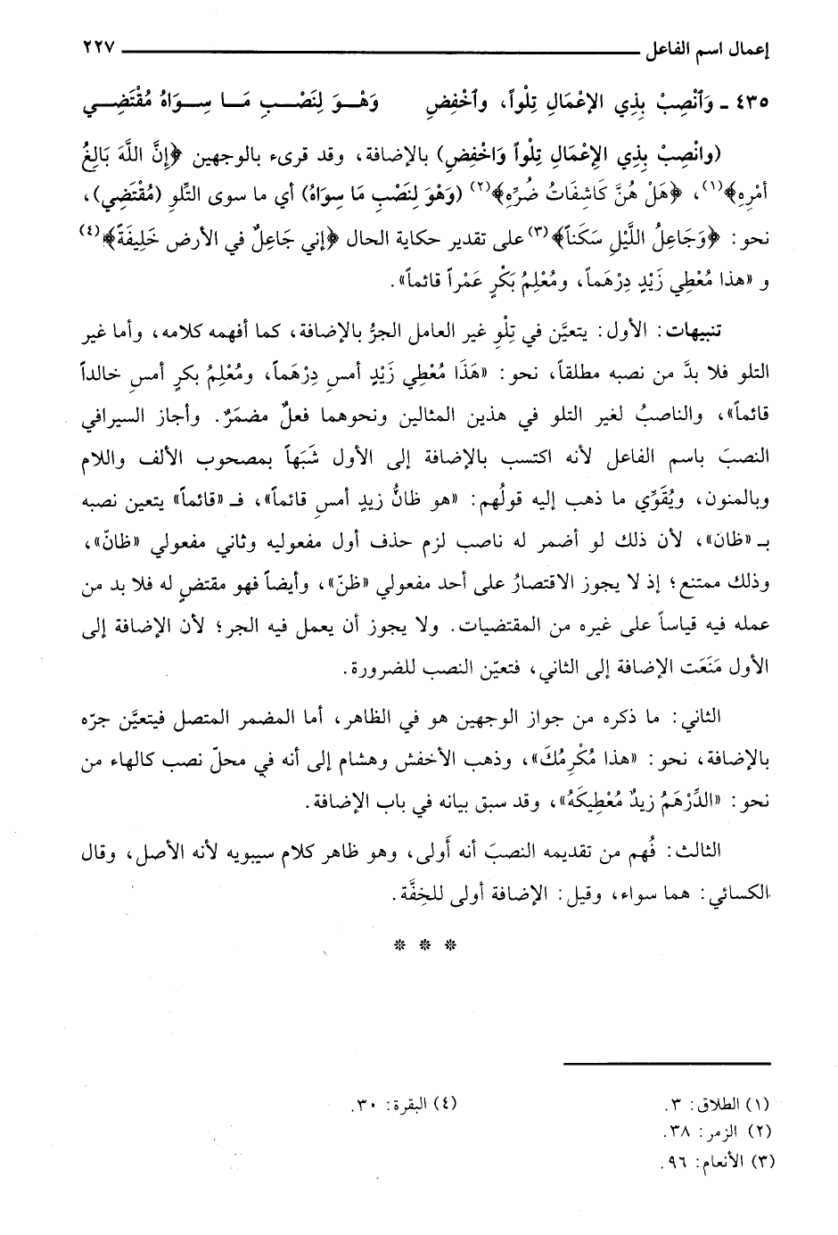 "وانصب بذي الإعمال تلوا واخفض" بالإضافة، وقد قرئ بالوجهين {إِنَّ اللَّهَ بَالِغُ أَمْرِه} 1، {هَلْ هُنَّ كَاشِفَاتُ ضُرِّه} 2 "وهو لنصب ما سواه" أي ما سوى التلو "مقتضي"، نحو: "وجاعلُ الليلِ سكنًا"3 على تقدير حكاية الحال {إِنِّي جَاعِلٌ فِي الْأَرْضِ خَلِيفَةً} 4 و"هذا معطي زيدٍ درهمًا، ومعلمُ بكرٍ عمرًا قائمًا".