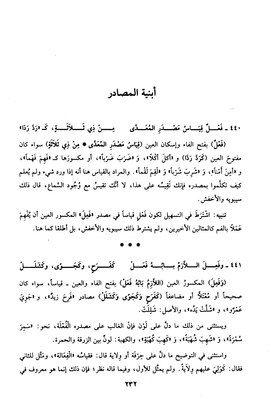 "فعل" بفتح الفاء وإسكان العين "قيام مصدر المعدي من ذي ثلاثة" سواء كان مفتوح العين "كرد ردا" و"أكل أكلًا"، و"ضرب ضربًا"، أو مكسورها كـ"فهم فهمًا"، و"أمن أمنًا"، و"شرب شربًا" و"لقم لقمًا". والمراد بالقياس هنا أنه إذا ورد شيء ولم يعلم كيف تكلموا بمصدره فإنك تقيسه على هذا، لا أنك تقيس مع وجود السماع، قال ذلك سيبويه والأخفش.