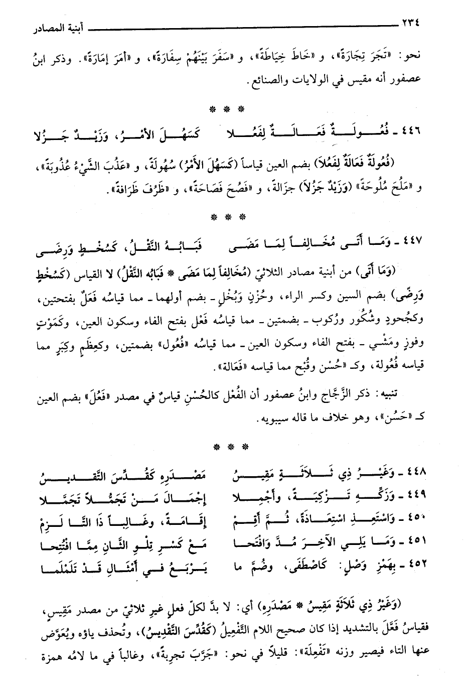 "وما أتى" من أبنية مصادر الثلاثي "مخالفًا لما مضى فبابه النقل" لا القياس "كسُخط ورِضى" بضم السين وكر الراء، وحُزن وبُخل -بضم أولهما- مما قياسه فَعَل بفتحتين، وكجحود وشكور وركوب -بضمتين- مما قياسه فعل بفتح الفاء وسكون العين، وكموت وفوز ومشي -بفتح الفاء وسكون العين- مما قياسه "فُعُول" بضمتين، وكعظم وكبر مما قياسه فُعُولة، وكـ"حُسن وقُبح مما قياسه "فَعَالة".