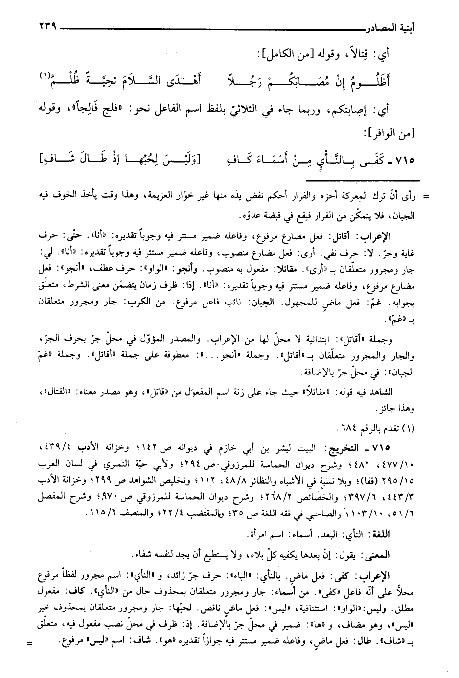 715- التخريج: البيت لبشر بن أبي خازم في ديوانه ص142؛ وخزانة الأدب 4/ 439؛ 10/ 477، 482؛ وشرح ديوان الحماسة للمرزوقي ص294؛ ولأبي حية النميري في لسان العرب 15/ 295 "قفا"؛ وبلا نسبة في الأشباه والنظائر 8/ 48، 112؛ وتخليص الشواهد ص299؛ وخزانة الأدب 3/ 443، 6/ 397؛ والخصائص 2/ 268؛ وشرح ديوان الخماسة للمرزوقي ص970؛ وشرح المفصل 6/ 51، 10/ 103؛ والصاحبي في فقه اللغة ص35؛ والمقتضب 4/ 22؛ والمنصف 2/ 115.