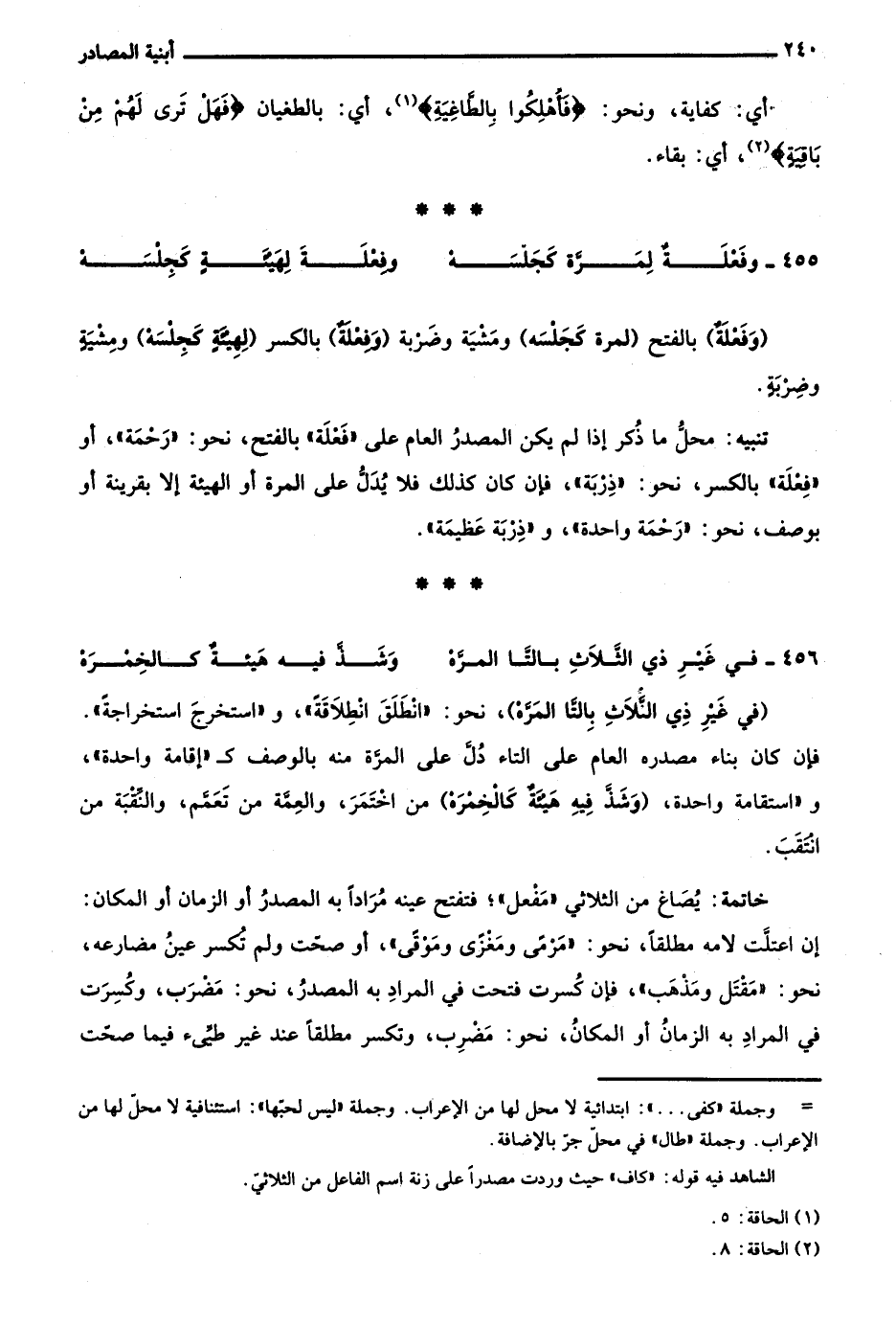 "وفَعلة" بالفتح "لمرة كجَلْسَه" ومشية وضربه "وفِعلة" بالكسر "لهيئة كجِلْسَة" ومشية وضربة.