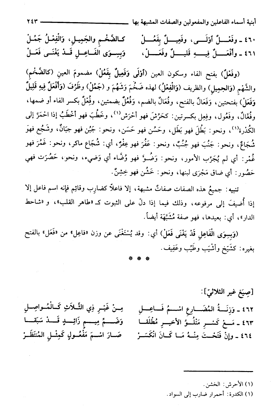 تنبيه: جميع هذه صفات مشبهة، إلا فاعلًا كضارب وقائم فإنه اسم فاعل إلا إذا أضيف إلى مرفوعه، وذلك فيما إذا دل على الثبوت كـ"طاهر القلب"، و"شاحط الدار"، أي: بعيدها، فهو صفة مشبهة أيضًا.