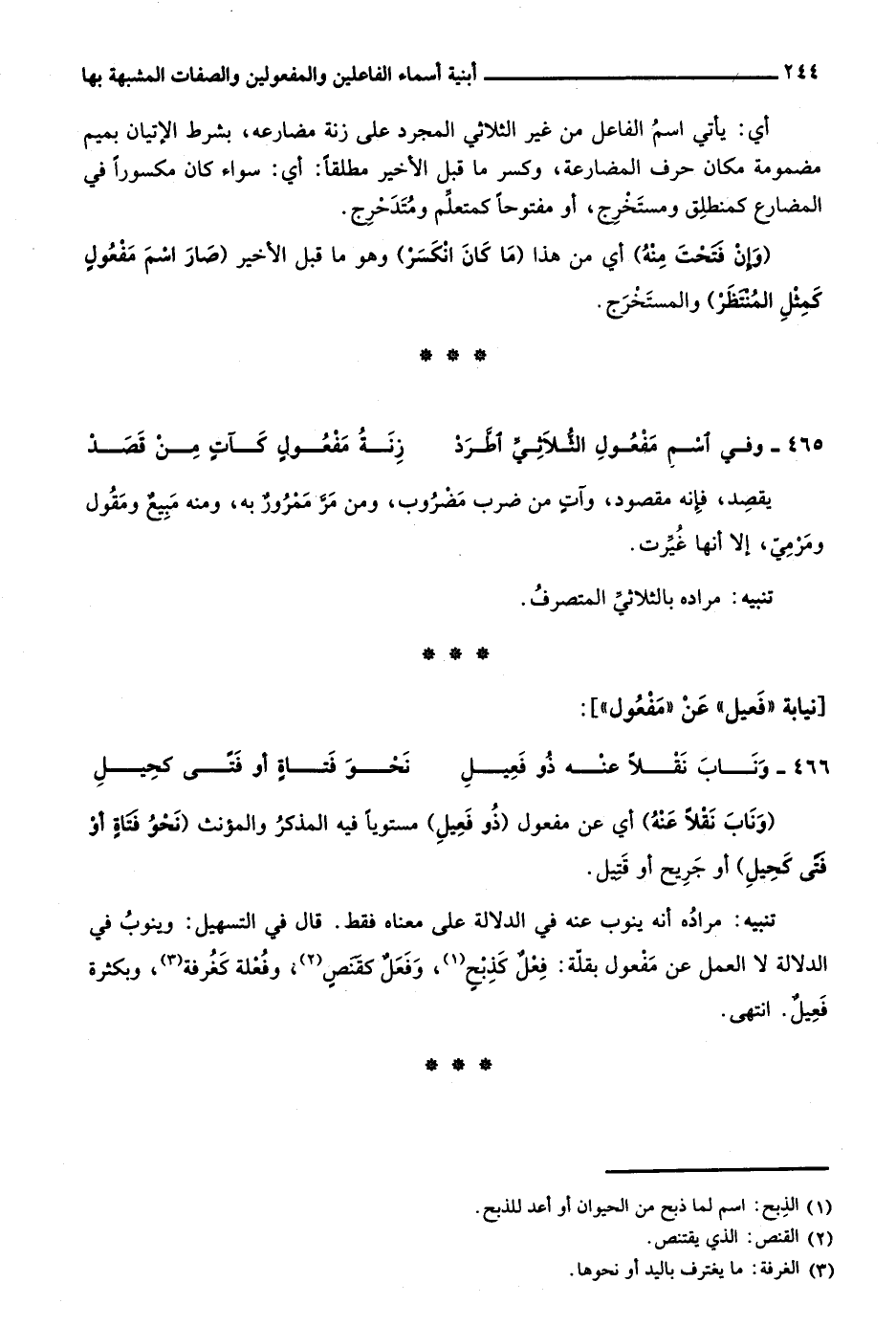 تنبيه: مراده أنه ينوب عنه في الدلالة على معناه فقط. قال في التسهيل: وينوب في الدلالة لا العمل عن مفعول بقلة: فِعْل كذِبْح1، وفَعَل كقَنَص2، وفُعْله كغُرفة3، وبكثرة فَعِيل. ا. هـ.
