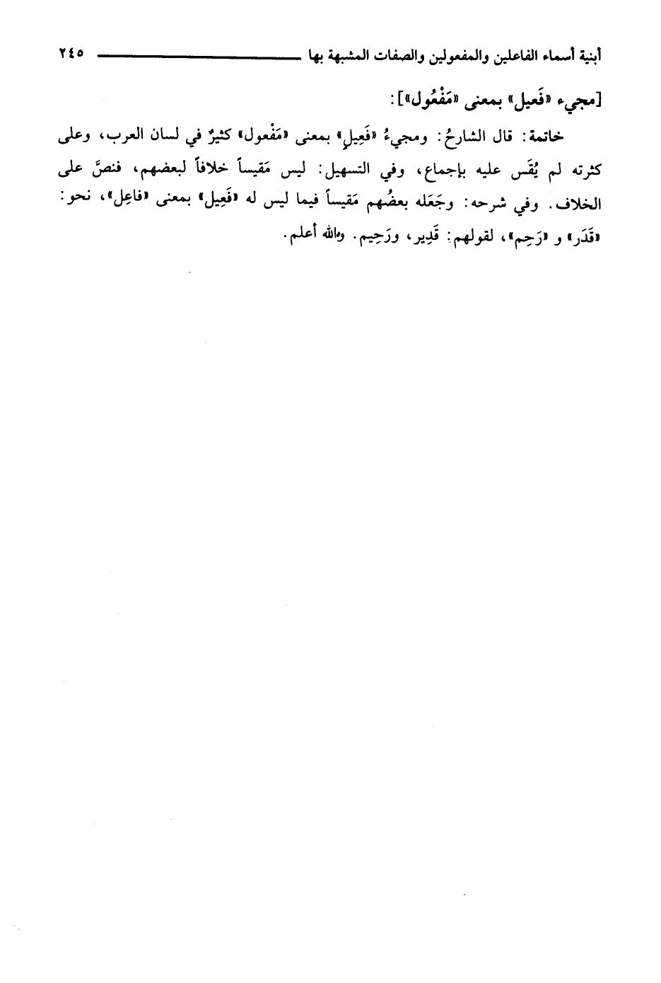 خاتمة: قال الشارح: ومجيء "فعيل" بمعنى "مفعول" كثير في لسان العرب، وعلى كثرته لم يقس عليه بإجماع، وفي التسهيل: ليس مقيسًا خلافًا لبعضهم، فنص على الخلاف، وفي شرحه: "وجعله بعضهم مقيسًا فيما ليس له "فعيل" بمعى "فاعل"، نحو: "قَدَر" و"رَحِم"، لقولهم: قدير، ورحيم. والله أعلم.