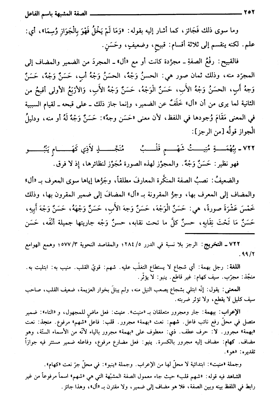 فالقبيح: رفع الصفة -مجردة كانت أو مع "أل"- المجرد من الضمير والمضاف إلى المجرد منه، وذلك ثمان صور هي: الحسنُ وجهٌ، الحسنُ وجهُ أبٍ، حسنٌ وجهٌ، حسنٌ وجهُ أبٍ، الحسنُ وجهُ الأبِ، حسنٌ الوجهُ، حسنٌ وجهُ الأبِ، والأربع الأولى أقبح من الثانية لما يرى من أن "أل" خلف عن الضمير، وإنما جاز ذلك -على قبحه- لقيام السببية في المعنى مقام وجودها في اللفظ؛ لأن معنى "حسن وجه": حسن وجه له أو منه، ودليل الجواز قوله "من الرجز":