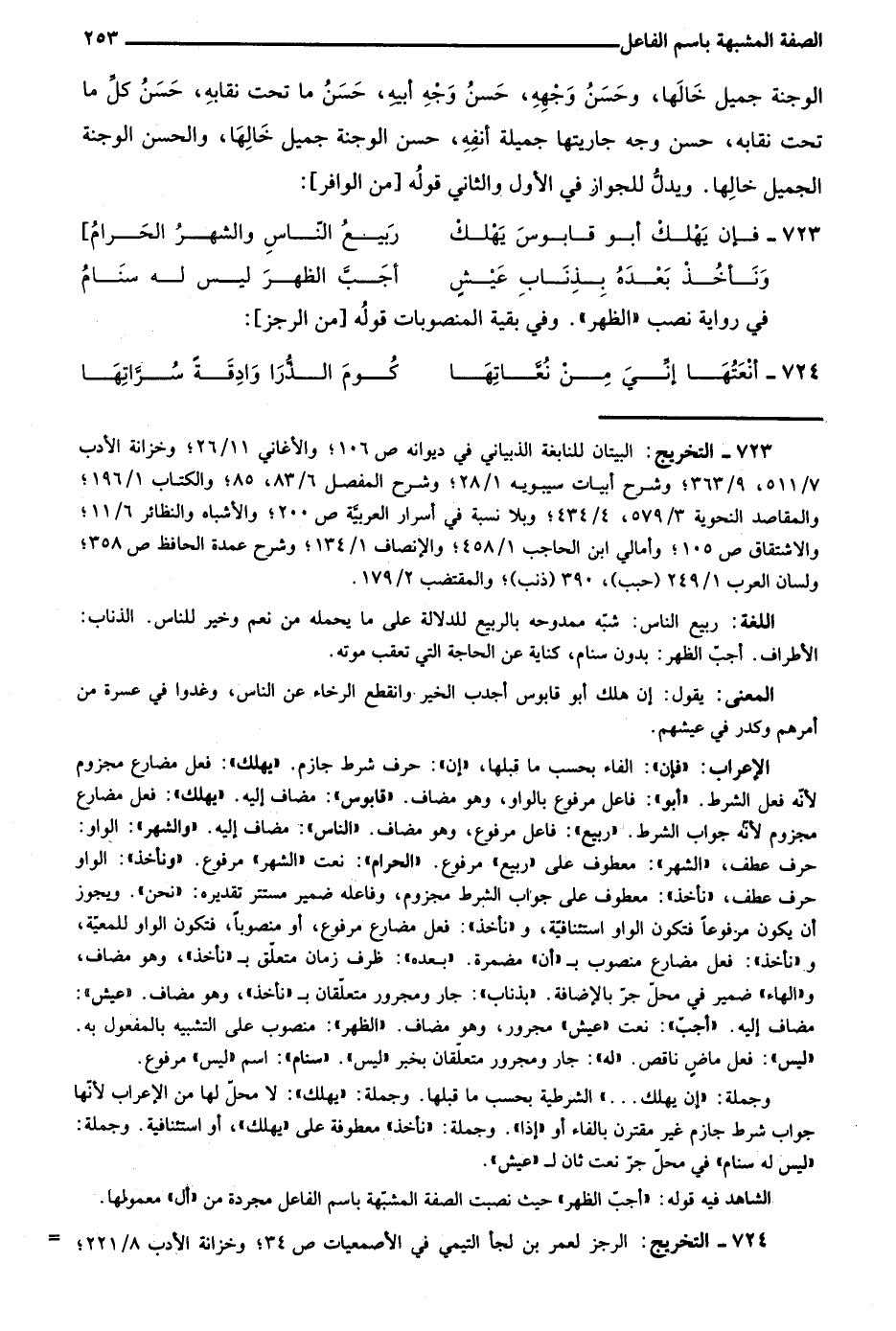 الإعراب: "فإن" الفاء بحسب ما قبلها، "إن": حرف شرط جازم. "يهلك": فعل مضارع مجزوم لأنه فعل الشرط. "أبو": فاعل مرفوع بالواو، وهو مضاف. "قابوس": مضاف إليه. "يهلك": فعل مضارع مجزوم لأنه جواب الشرط. "ربيع": فاعل مرفوع، وهو مضاف. "الناس": مضاف إليه. "والشهر": الواو: حرف عطف، "الشهر": معطوف على "ربيع" مرفوع. "الحرام": نعت "الشهر" مرفوع. "ونأخذ": الواو حرف عطف، "نأخذ": معطوف على جواب الشرط مجزوم، وفاعله ضمير مستتر تقديره: "نحن". ويجوز أن يكون مرفوعًا فتكون الواو استئنافية، و"نأخذ": فعل مضارع مرفوع، أو منصوبًا، فتكون الواو للمعية، و"نأخذ": فعل مضارع منصوب بـ"أن" مضمرة. "بعده": ظرف زمان متعلق بـ"نأخذ"، وهو مضاف و"الهاء" ضمير في محل جر بالإضافة "بذناب": جار ومجرور متعلقان بـ"نأخذ"، وهو مضاف. "عيش": مضاف إليه. "أجب": نعت "عيش"، مجرور، وهو مضاف. "الظهر": منصوب على التشبيه بالمفعول به. "ليس": فعل ماض ناقص. "له": جار ومجرور متعلقان بخبر "ليس". "سنام": اسم "ليس" مرفوع.