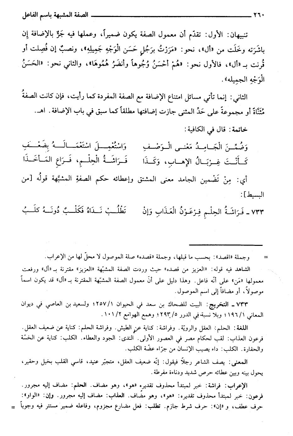 تنبيهان: الأول: تقدم أن معمول الصفة يكون ضميرًا، وعملها فيه جر بالإضافة إن باشرته وخلت من "أل"، نحو: "مررت برجلٍ حسن الوجهِ جميلِهِ"، ونصب إن فصلت أو قرنت بـ"أل"، فالأول نحو: "هم أحسنُ وجوهًا وأنضرُ هموها"، والثاني نحو: "الحسنُ الوجهِ الجميله".