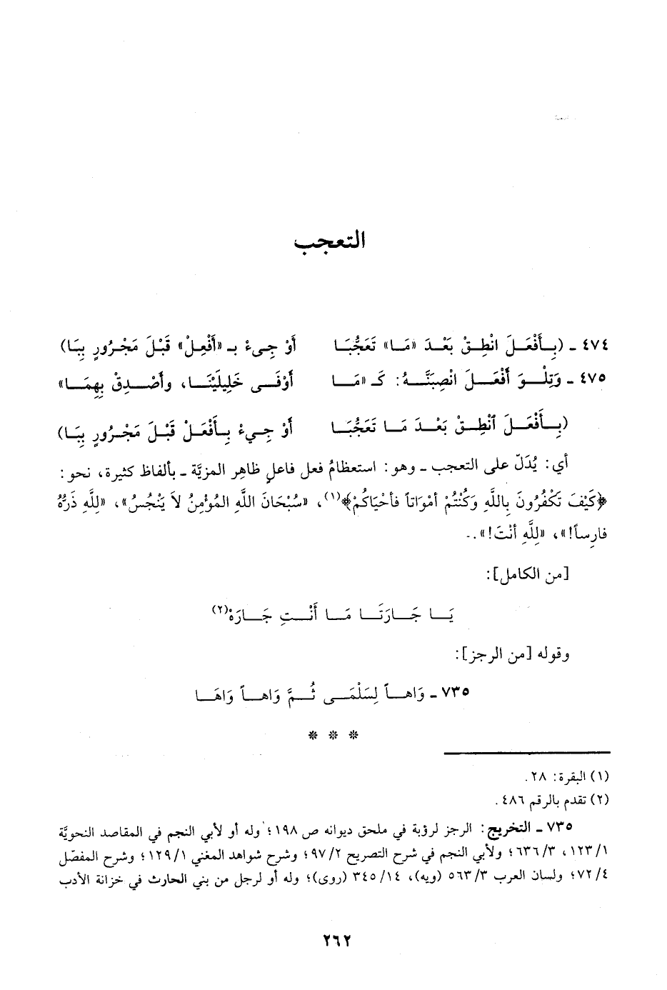 أي: يدل على التعجب -وهو: استعظام فعل فاعل ظاهر المزية- بألفاظ كثيرة، نحو: {كَيْفَ تَكْفُرُونَ بِاللَّهِ وَكُنْتُمْ أَمْوَاتًا فَأَحْيَاكُمْ} 1، "سبحان الله المؤمن لا ينجس"، "لله دره فارسًا! "، "لله أنت! ".