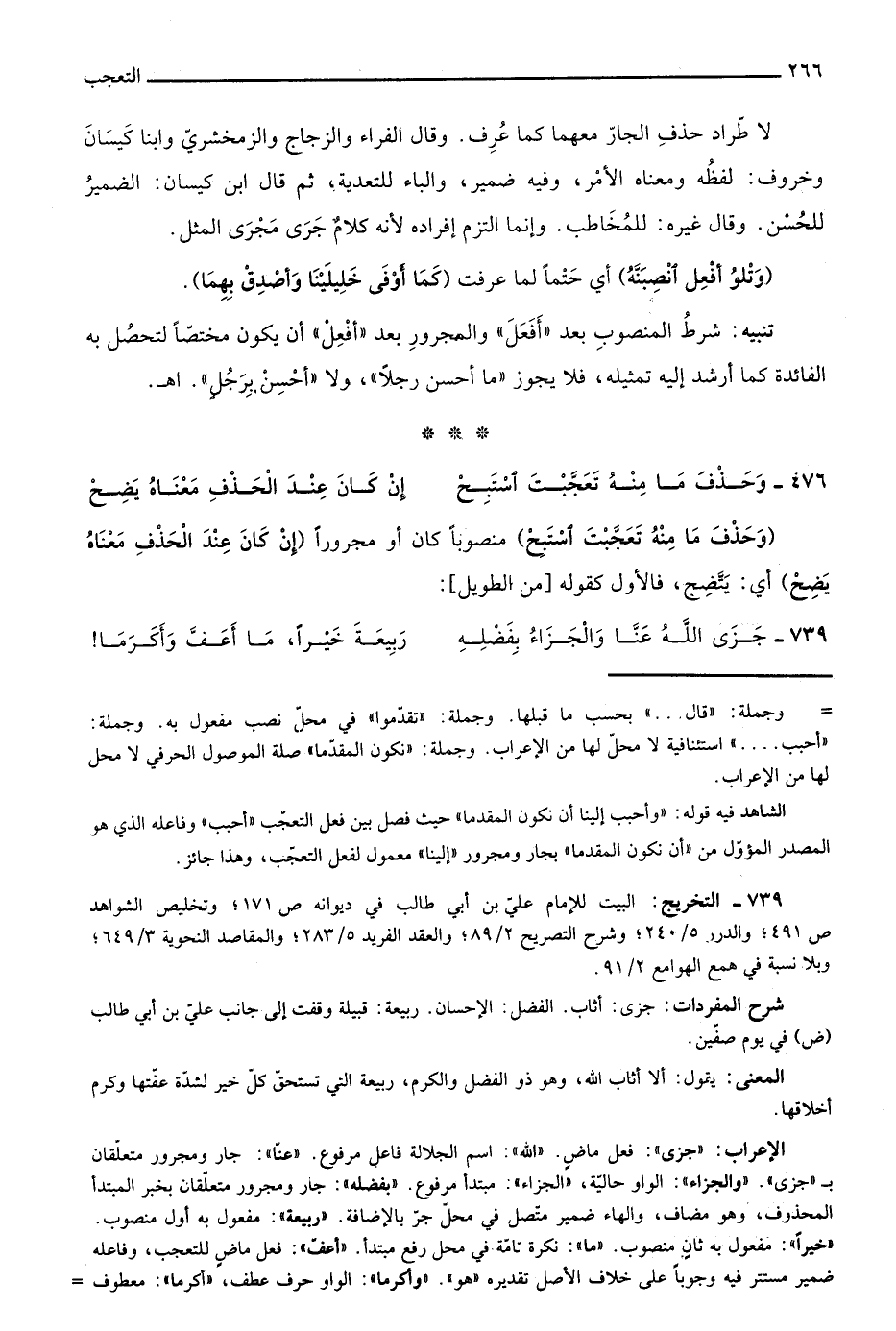 الإعراب: "جزى": فعل ماض. "الله" اسم الجلالة فاعل مرفوع. "عنا": جار ومجرور متعلقان بـ"جزى". "والجزاء": الواو حالية، "الجزاء": مبتدأ مرفوع. "بفضله": جار ومجرور متعلقان بخبر المبتدأ المحذوف، وهو مضاف، والهاء ضمير متصل في محل جر بالإضافة "ربيعة": مفعول به أول منصوب. "خيرًا": مفعول به ثان منصوب. "ما": نكرة تامة في محل رفع مبتدأ. "أعف": فعل ماض للتعجب، وفاعله ضمير مستتر فيه وجوبًا على خلاف الأصل تقديره "هو". "وأكرما": الواو حرف عطف، "أكرما": معطوف =