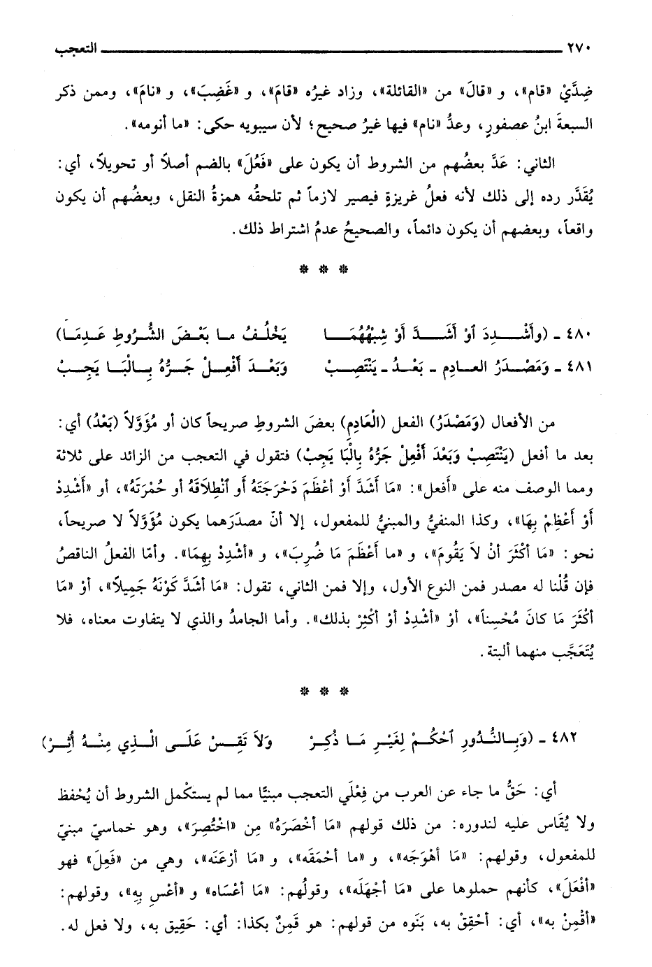 من الأفعال "ومصدر" الفعل "العادم" بعض الشروط صريحًا كان أو مؤولًا "بعد" أي: بعد ما أفعل "ينتصب وبعد أفعل جره بالبا يجب" فتقول في التعجب من الزائد على ثلاثة ومما الوصف منه على "أفعل": "ما أشد أو أعظم دحرجته أو انطلاقه أو حمرته"، أو "أشدد أو أعظم بها"، وكذا المنفي والمبني للمفعول، إلا أن مصدرهما يكون مؤولًا لا صريحًا، نحو: "ما أكثر أن لا يقوم"، و"ما أعظم ما ضرب"، و"أشدد بهما". وأما الفعل الناقص فإن قلنا له مصدر فمن النوع الأول، وإلا فمن الثاني، تقول: "ما أشد كونه جميلا"، أو "ما أكثر ما كان محسنًا"، أو "أشدد أو أكثر بذلك". وأما الجامد والذي لا يتفاوت معناه، فلا يتعجب منهما ألبتة.