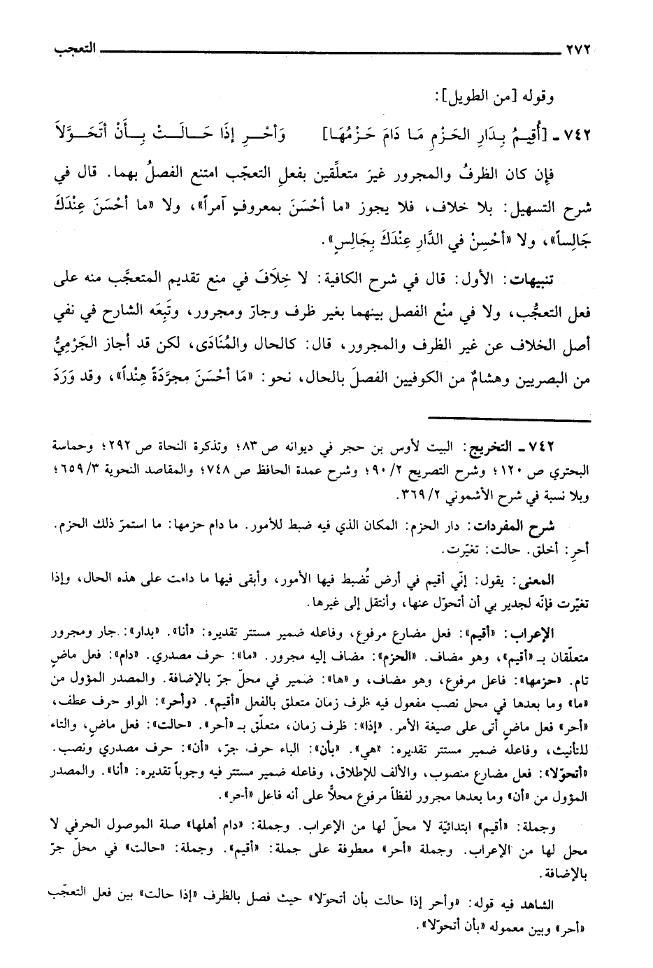 الإعراب: "أقيم": فعل مضارع مرفوع، وفاعله ضمير مستتر تقديره: "أنا". "بدار": جار ومجرور متعلقان بـ"أقيم"، وهو مضاف. "الحزم": مضاف إليه مجرور. "ما": حرف مصدري. "دام": فعل ماض تام. "حزمها": فاعل مرفوع، وهو مضاف، و"ها": ضمير في محل جر بالإضافة. والمصدر المؤول من "ما" وما بعدها في محل نصب مفعول فيه ظرف زمان متعلق بالفعل "أقيم". "وأحر": الواو حرف عطف، "أحر" فعل ماض أتى على صيغة الأمر. "إذا": ظرف زمان متعلق بـ"أحر". "حالت": فعل ماض، والتاء للتأنيث، وفاعله ضمير مستتر تقديره: "هي". "بأن": الباء حرف جر، "أن": حرف مصدري ونصب. "أتحولا": فعل مضارع منصوب، والألف للإطلاق، وفاعله ضمير مستتر فيه وجوبًا تقديره: "أنا". والمصدر المؤول من "أن" وما بعدها مجرور لفظًا مرفوع محلًّا على أنه فاعل "أحر".