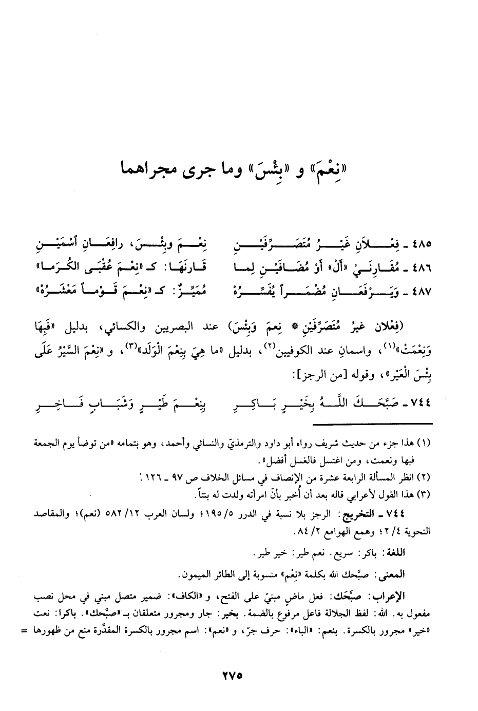"فعلان غير متصرفين نعم وبئس" عند البصريين والكسائي، بدليل "فبها ونعمت"1؛ واسمان عند الكوفيين2؛ بدليل "ما هي بنعم الولد"3؛ و "نعم السيرُ على بئس العير"، وقوله "من الرجز":