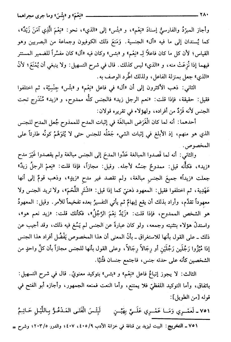 وأجاز المبرد والفارسي إسناد "نعم"، و"بئس" إلى "الذي"، نحو:"نعم الذي آمن زيدٌ"، كما يُسندان إلى ما فيه "أل" الجنسية. ومنع ذلك الكوفيون وجماعة من البصريين وهو القياس؛ لأن كل ما كان فاعلًا لـ"نعم"، و"بئس" وكان فيه "أل" كان مفسرًا للضمير المستتر فيهما إذا نزعت منه، و"الذي" ليس كذلك. قال في شرح التسهيل: ولا ينبغي أن يمنع؛ لأن "الذي" جعل بمنزلة الفاعل، ولذلك اطرد الوصف به.