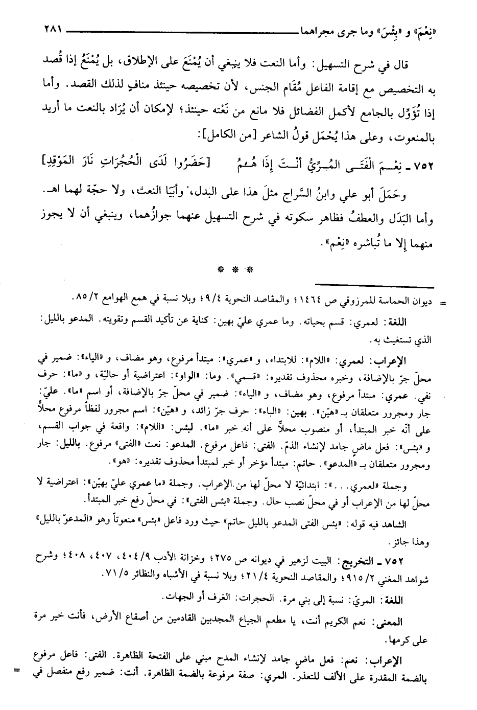 الإعراب: نعم: فعل ماض جامد لإنشاء المدح مبني على الفتحة الظاهرة. الفتى: فاعل مرفوع بالضمة المقدرة على الألف للتعذر. المري: صفة مرفوعة بالضمة الظاهرة. أنت: ضمير رفع منفصل في =