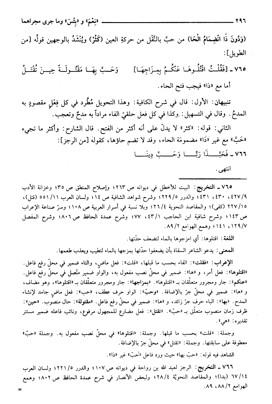"ودون ذا انضمام الحا" من حب بالنقل من حركة العين "كثر" وينشد بالوجهين قوله "من الطويل":