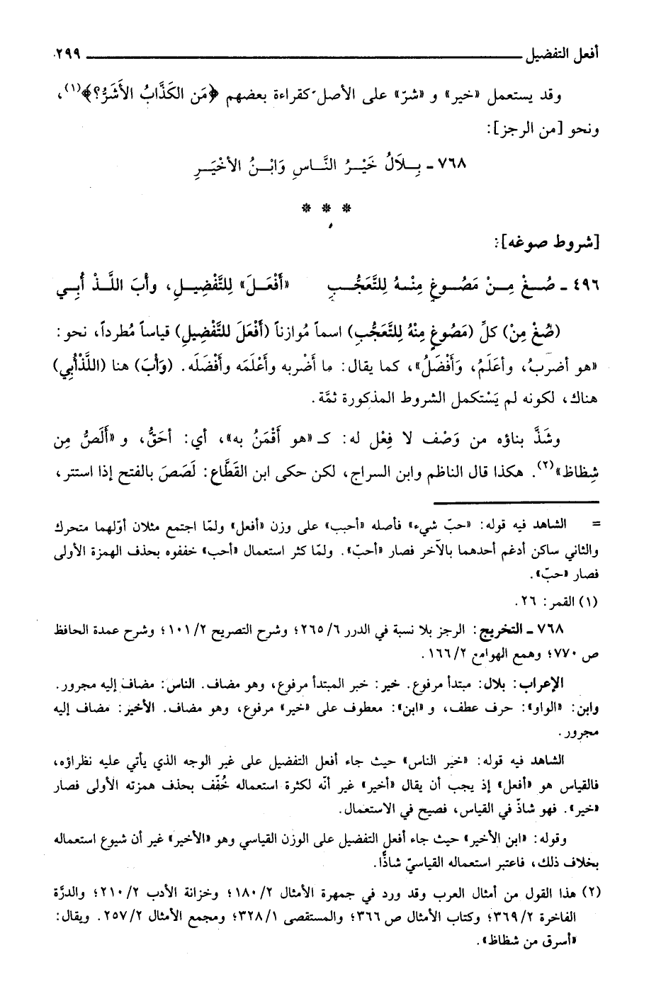 "صغ من" كل "مصوغ منه للتعجب" اسمًا موازنًا "أفعل للتفضيل" قياسًا مطردًا، نحو: "هو أضرب، وأعلم، وأفضل"، كما يقال: ما أضربه وأعلمه وأفضله. "وأب" هنا "اللذأبي" هناك، لكونه لم يستكمل الشروط المذكورة ثمة.