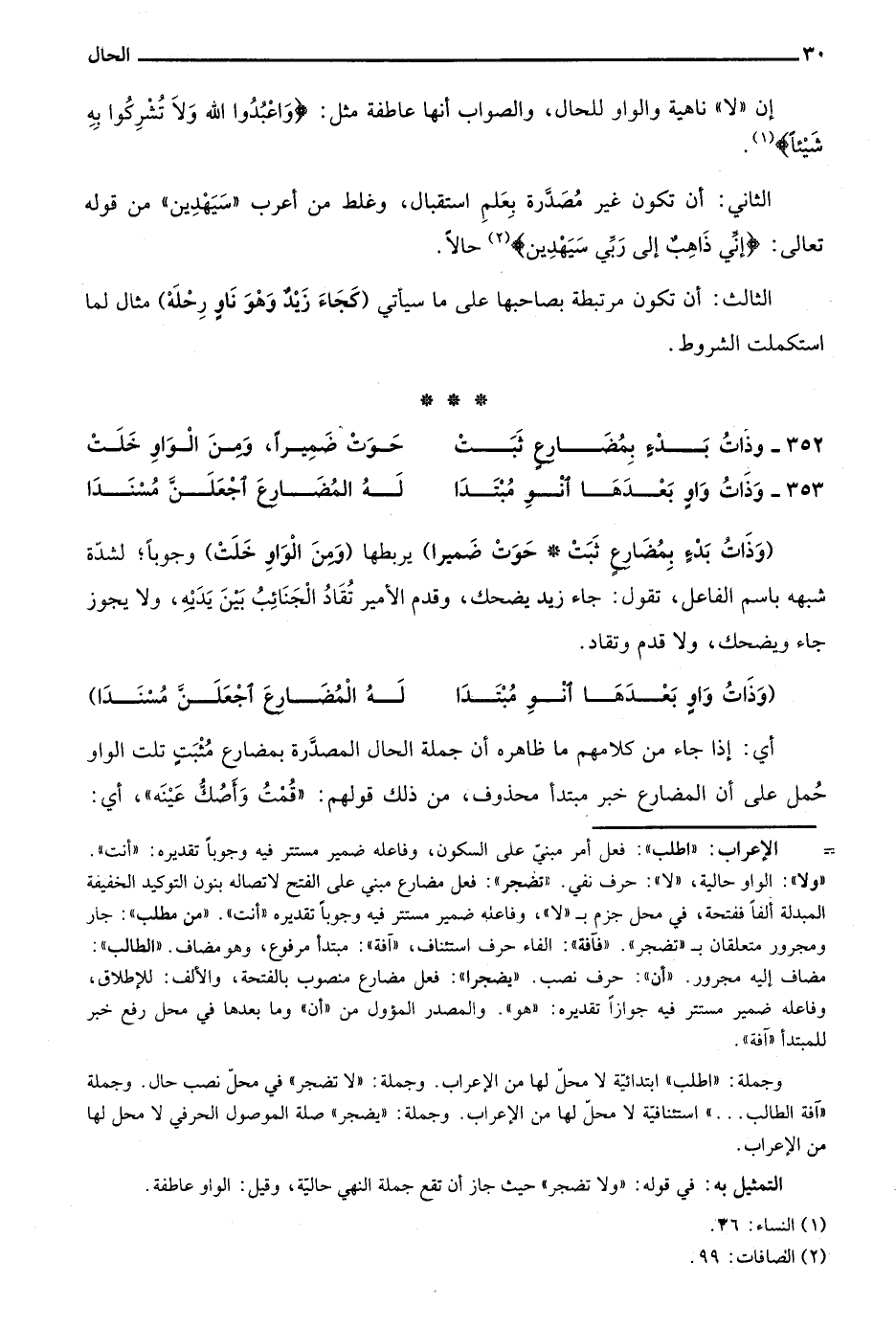 "وذات بدء بمضارع ثبت حوت ضميرا" يربطها "ومن الواو خلت" وجوبا؛ لشدة شبهه باسم الفاعل، تقول: جاء زيد يضحك، وقدم الأمير تقاد الجنائب بين يديه، ولا يجوز جاء ويضحك، ولا قدم وتقاد.