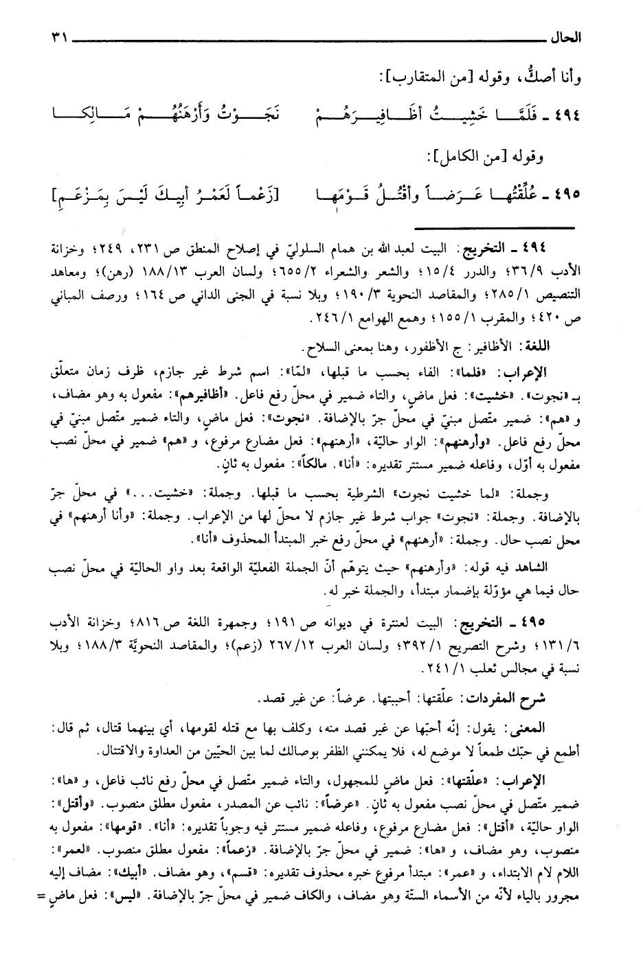 الإعراب: "فلما": الفاء بحسب ما قبلها، "لما": اسم شرط غير جازم، ظرف زمان متعلق بـ"نجوت". "خشيت": فعل ماض، والتاء ضمير في محل رفع فاعل. "أظافيرهم": مفعول به وهو مضاف، و"هم": ضمير متصل مبني في محل جر بالإضافة. "نجوت": فعل ماض، والتاء ضمير متصل مبني في محل رفع فاعل. "وأرهنهم": الواو حالية، "أرهنهم": فعل مضارع مرفوع، و"هم" ضمير في محل نصب مفعول به أول، وفاعله ضمير مستتر تقديره: "أنا". "مالكا": مفعول به ثان.