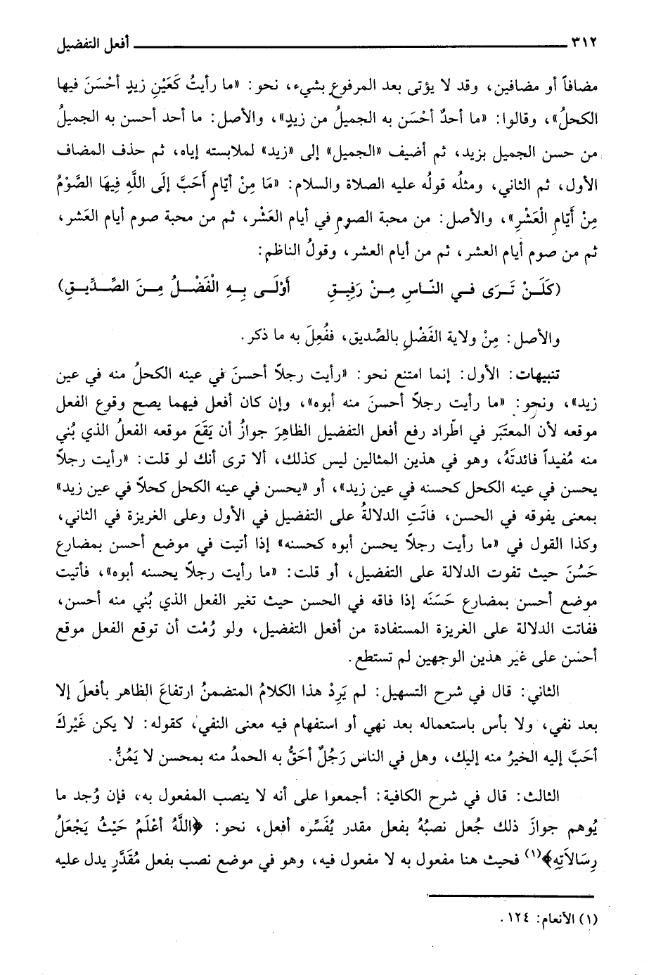 مضافًا أو مضافين، وقد لا يؤتى بعد المرفوع بشيء، نحو: "ما رأيت كعين زيد أحسن فيها الكحل"، وقالوا: "ما أحد أحسن به الجميل من زيد" والأصل: ما أحد أحسن به الجميل من حسن الجميل بزيد، ثم أضيف "الجميل" إلى "زيد" لملابسته إياه، ثم حذف المضاف الأول، ثم الثاني، ومثله قوله عليه الصلاة والسلام: "ما من أيام أحب إلى الله فيها الصوم من أيام العشر"، والأصل: من محبة الصوم في أيام العشر، ثم من محبة صوم أيام العشر، ثم من صوم أيام العشر، ثم من أيام العشر، وقول الناظم:
