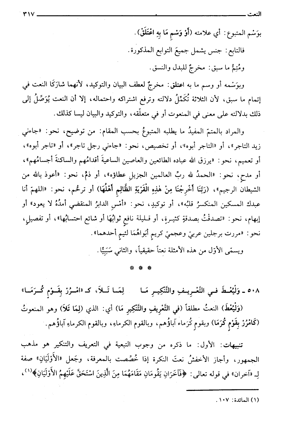 تنبيهات: الأول: ما ذكره من وجوب التبعية في التعريف التنكير هو مذهب الجمهور، وأجاز الأخفش نعت النكرة إذا خصصت بالمعرفة، وجعل "الأوليان" صفة لـ"آخران" في قوله تعالى: {فَآَخَرَانِ يَقُومَانِ مَقَامَهُمَا مِنَ الَّذِينَ اسْتَحَقَّ عَلَيْهِمُ الْأَوْلَيَانِ} 1،