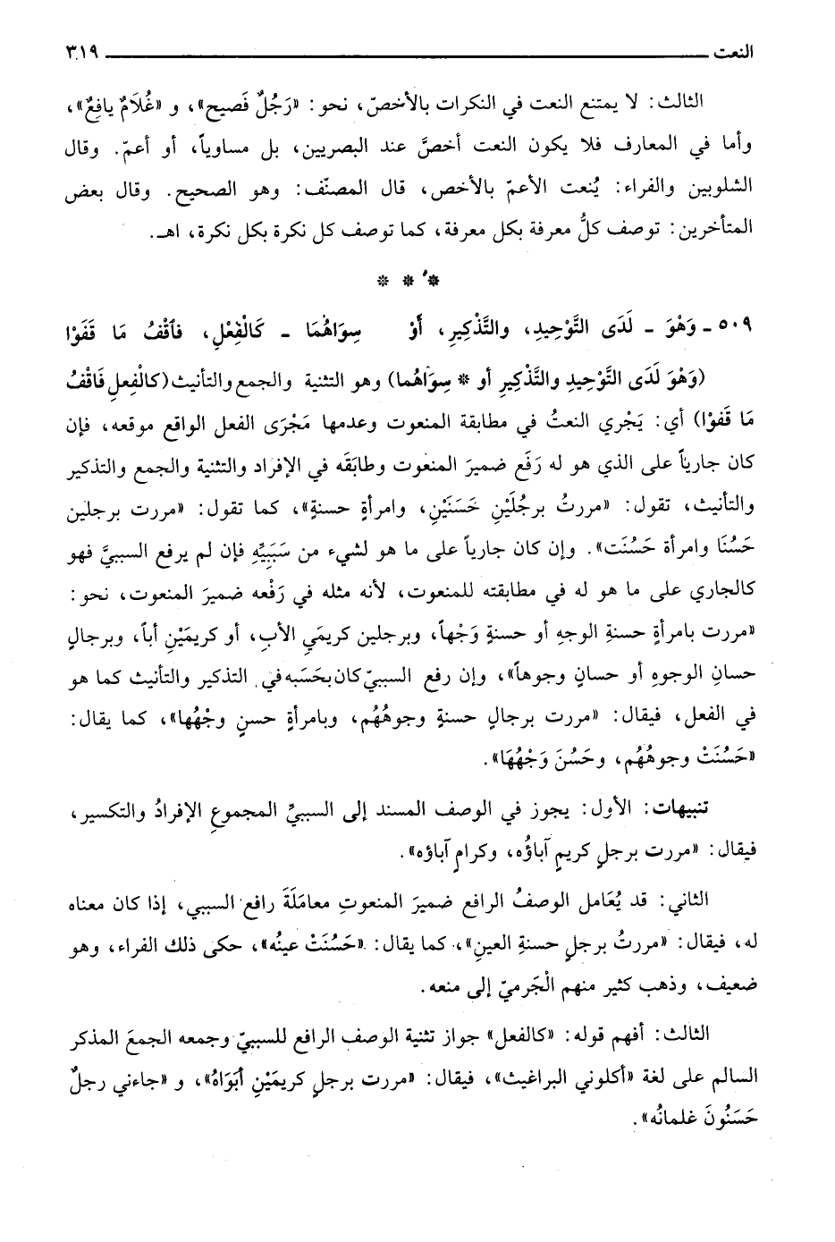 "وهو لدى التوحيد والتذكير أو سواهما" وهو التثنية والجمع والتأنيث "كالفعل فاقف ما قفوا" أي: يجري النعت في مطابقة المنعوت وعدمها مجرى الفعل الواقع موقعه، فإن كان جاريًا على الذي هو له رفع ضمير المنعوت وطابقه في الإفراد والتثنية والجمع والتذكير والتأنيث، تقول: "مررت برجلين حسنين، وامرأة حسنة"، كما تقول: "مررت برجلين حسنًا وامرأة حسنت". وإن كان جاريًا على ما هو لشيء من سببه فإن لم يرفع السببي فهو كالجاري على ما هو له في مطابقته للمنعوت؛ لأنه مثله في رفعه ضمير المنعوت، نحو: "مررت بامرأةٍ حسنةِ الوجهِ أو حسنةٍ وجهًا، وبرجلين كريمي الأب، أو كريمين أبًا، وبرجال حسانِ الوجوهِ أو حسانٍ وجوهًا"، وإن رفع السببي كان بحسبه في التذكير والتأنيث كما هو في الفعل، فيقال: "مررت برجالٍ حسنةٍِ وجوهُهُم، وبامرأةٍ حسنٍ وجهُها"، كما يقال: "حسنت وجوهُهُم، وحسن وجهُهَا".