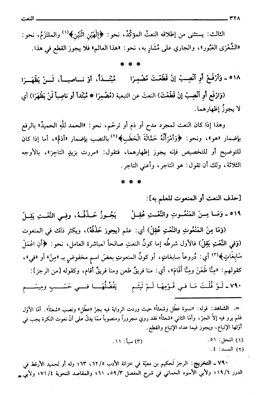 "وما من المنعوت والنعت عقل" أي: علم "يجوز حذفه"، ويكثر ذلك في المنعوت "وفي النعت يقل" فالأول شرطه إما كون النعت صالحًا لمباشرة العامل، نحو: {أَنِ اعْمَلْ سَابِغَاتٍ} 3 أي: دروعًا سابغات، أو كون المنعوت بعض اسم مخفوض بـ"من" أو "في"، كقولهم: "منا ظعن ومنا أقام"، أي: منا فريق ظعن ومنا فريق أقام، وكقوله "من الرجز":