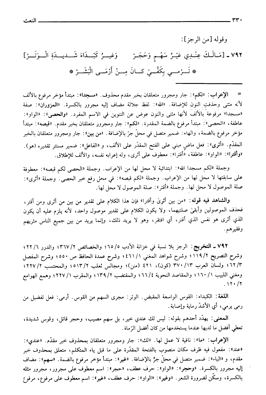 الإعراب: "ما": نافية لا عمل لها. "لك" جار ومجرور متعلقان بمحذوف خبر مقدم. "عندي": "عند" مفعول فيه ظرف مكان منصوب بالفتحة المقدرة على ما قيل ياء المتكلم، متعلق بمحذوف خبر مقدم، و"الباء": ضمير متصل في محل جر بالإضافة. "غير": مبتدأ مؤخر مرفوع بالضمة. "سهم": مضاف إليه مجرور بالكسرة. "وحجر": "الواو": حرف عطف، "حجر": اسم معطوف على مجرور، مجرور مثله بالكسرة، وسكن لضرورة الشعر. "وغير": "الواو": حرف عطف، "غير": اسم معطوف على مرفوع، مرفوع =