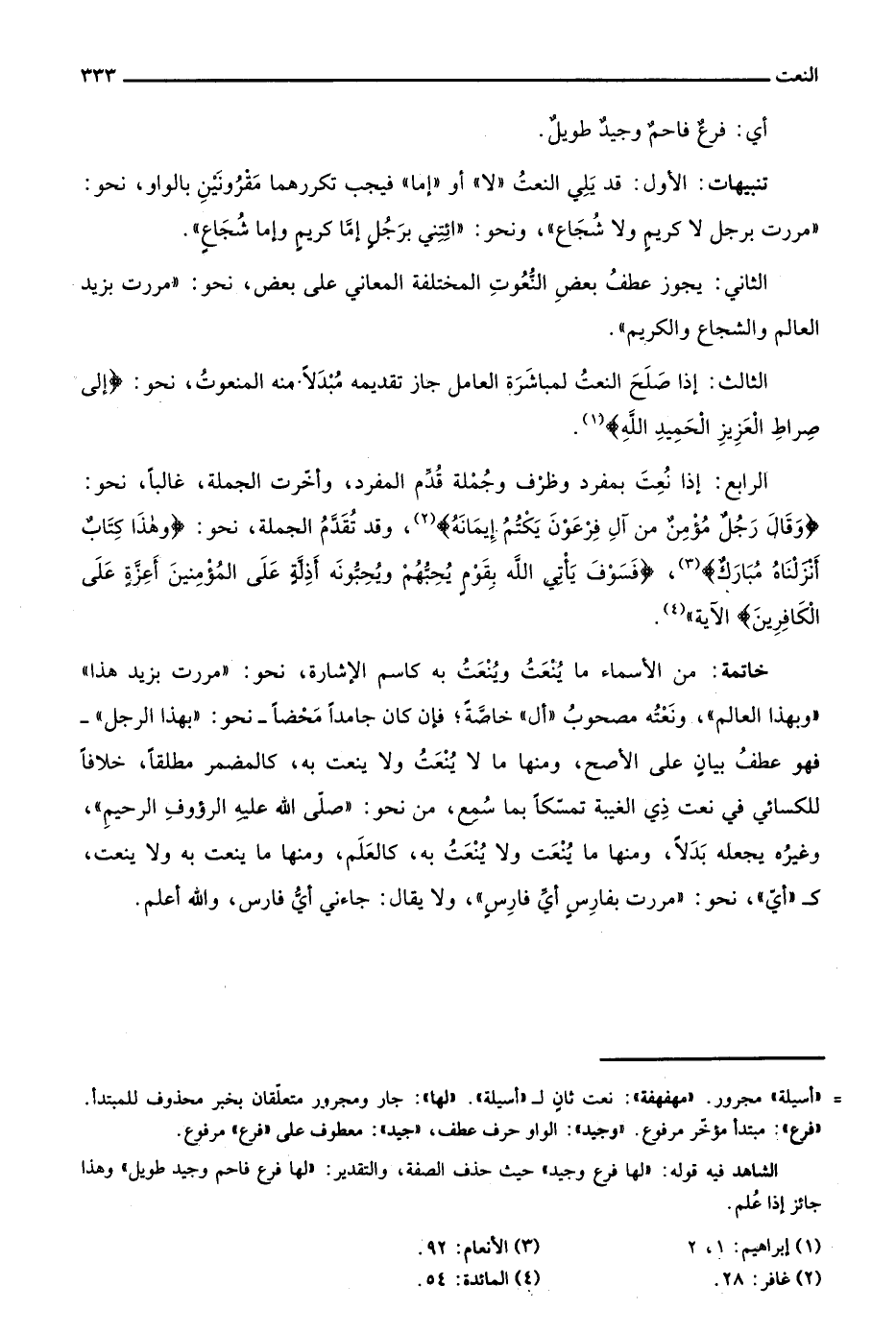 تنبيهات: الأول: قد يلي النعت "لا" أو "إما" فيجب تكررها مقرونين بالواو، نحو: "مررت برجل لا كريمٍ ولا شجاعٍ"، ونحو: "ائتني برجلٍ إما كريمٍ وإما شجاعٍ".