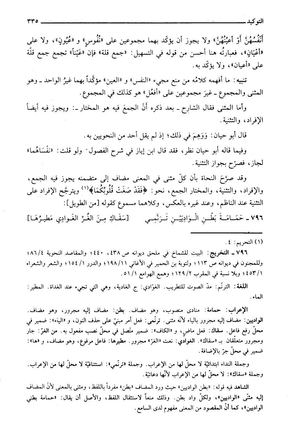 الشاهد فيه قوله: "بطن الواديين" حيث ورد المضاف "بطن" مفردًا باللفظ، ومثنى بالمعنى لأن المضاف إليه مثنى "الواديين"، ولكل واد بطن. وذلك منعًا لاستثقال اللفظ، والأصل أن يقال: "حمامة بطني الواديين" كما أن المقصود من المعنى مفهوم لدى السامع.