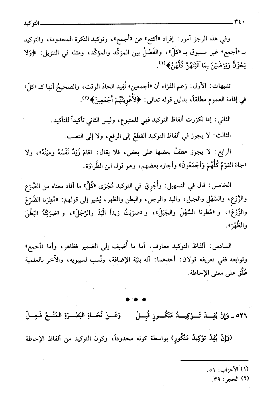 وفي هذا الرجز أمور: إفراد "أكتع" عن "أجمع"، وتوكيد النكرة المحدودة، والتوكيد بـ"أجمع" غير مسبوق بـ"كل"، والفصل بين المؤكِّد والمؤكَّد، ومثله في التنزيل: {وَلَا يَحْزَنَّ وَيَرْضَيْنَ بِمَا آَتَيْتَهُنَّ كُلُّهُنَّ} 1.