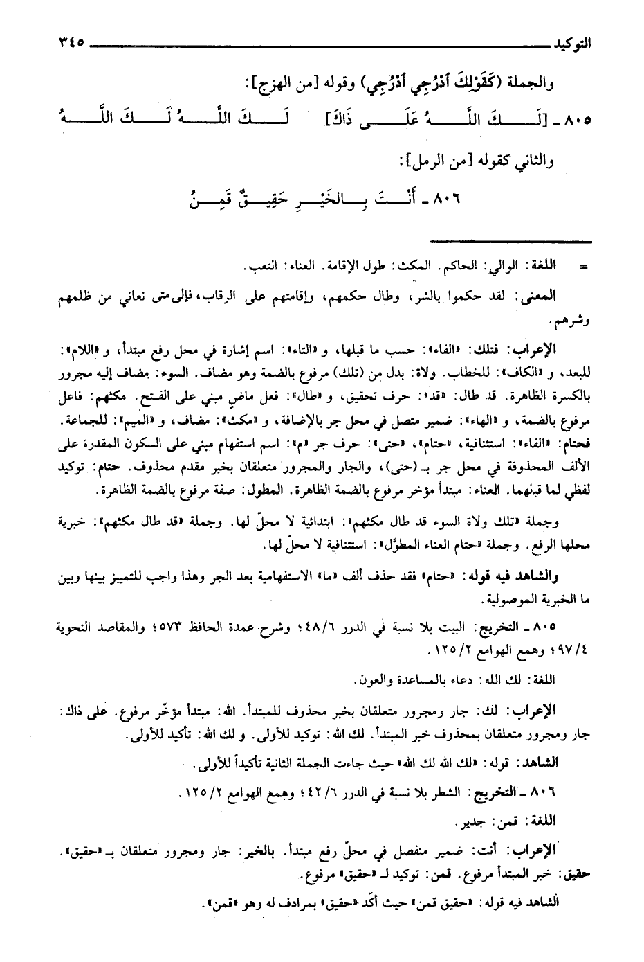 805- التخريج: البيت بلا نسبة في الدرر 6/ 48؛ وشرح عمدة الحافظ 573؛ والمقاصد النحوية 4/ 97؛ وهمع الهوامع 2/ 125.