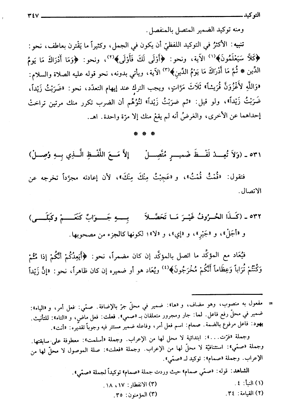 فيعاد مع المؤكد ما اتصل بالمؤكد إن كان مضمرًا، نحو: {أَيَعِدُكُمْ أَنَّكُمْ إِذَا مِتُّمْ وَكُنْتُمْ تُرَابًا وَعِظَامًا أَنَّكُمْ مُخْرَجُونَ} 4 ويعاد هو أو ضميره إن كان ظاهرًا، نحو: "إن زيدًا