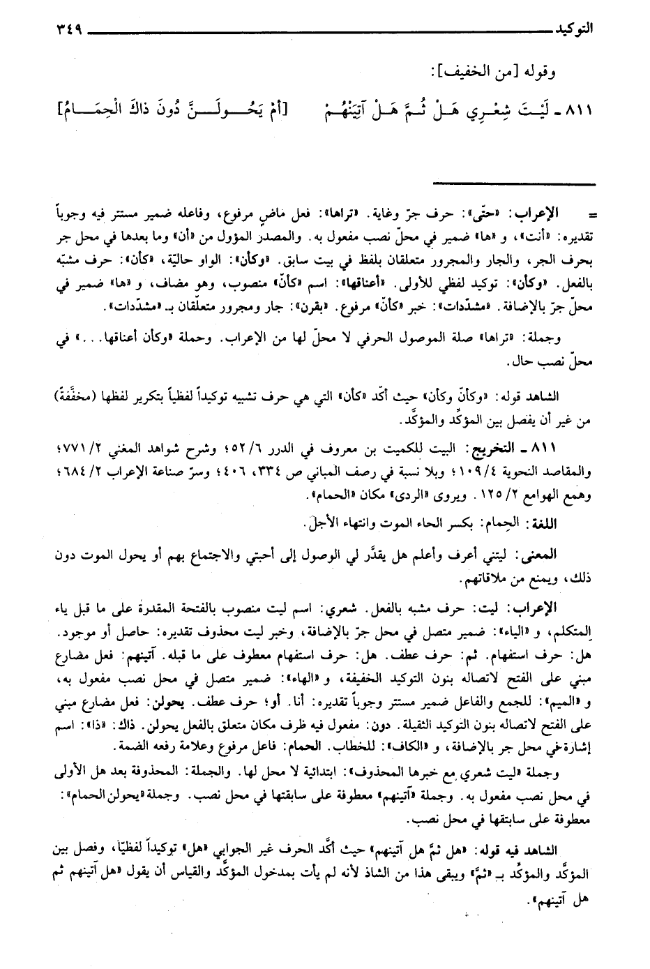 811- التخريج: البيت للكميت بن معروف في الدرر 6/ 52؛ وشرح شواهد المغني 2/ 771؛ والمقاصد النحوية 4/ 109؛ وبلا نسبة في رصف المباني ص334، 406؛ وسر صناعة الإعراب 2/ 684، وهمع الهوامع 2/ 125. ويروى "الردى" مكان "الحمام".
