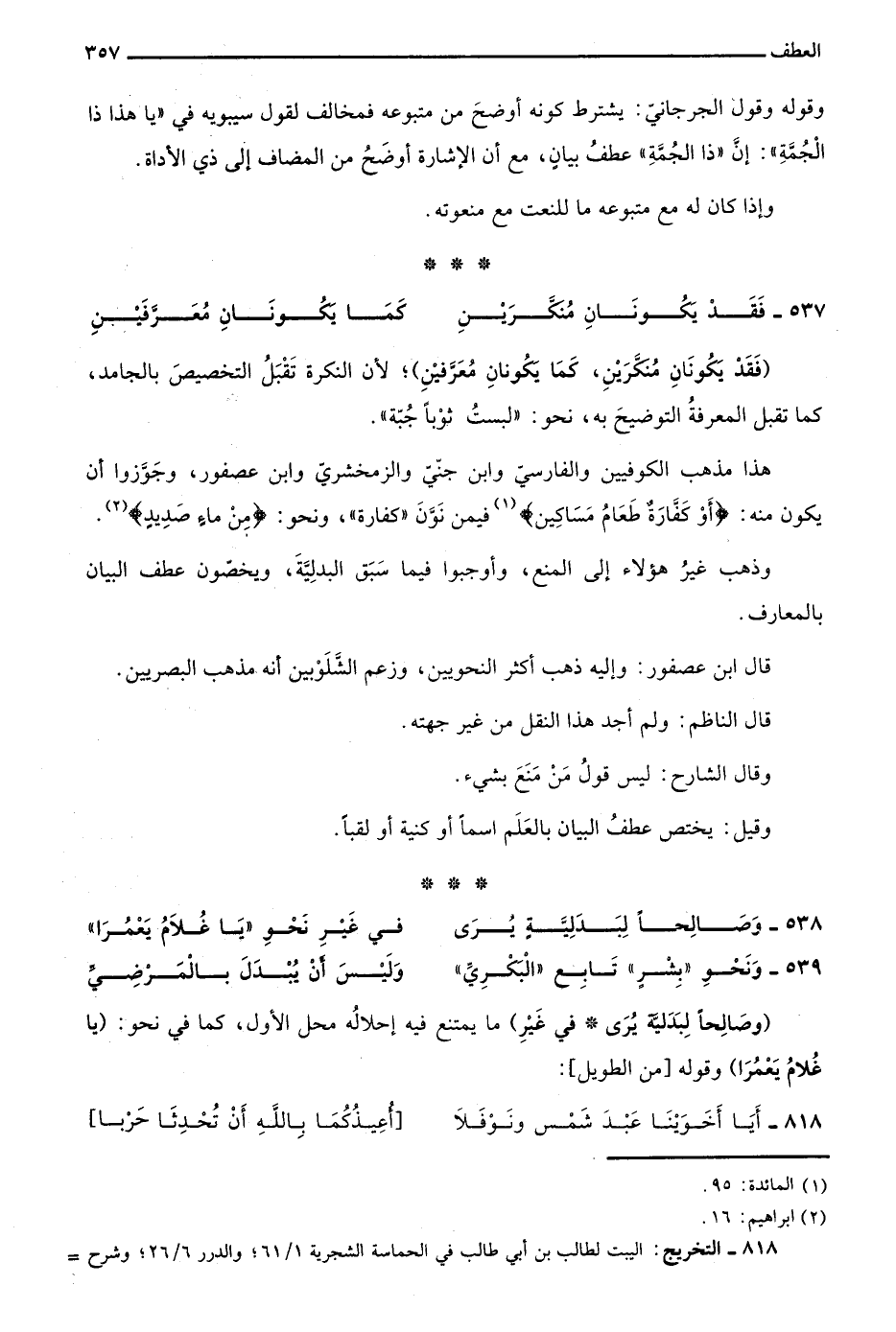 وقوله وقول الجرجاني: يشترط كونه أوضح من متبوعه فمخالف لقول سيبويه في "يا هذا ذا الجمة": إن "ذا الجمة" عطف بيان، مع أن الإشارة أوضح من المضاف إلى ذي الأداة.