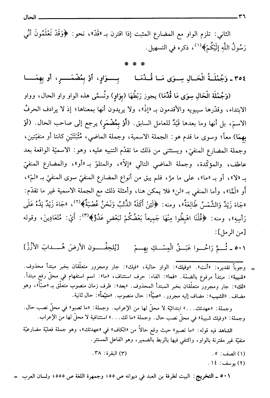 "وجملة الحال سوى ما قدما" يجوز ربطها "بواو" وتسمى هذه الواو واو الحال، وواو الابتداء، وقدرها سيبويه والأقدمون بـ"إذ"، ولا يريدون أنها بمعناها؛ إذ لا يرادف الحرف الاسم، بل إنها وما بعدها قيد للعامل السابق. "أو بمضمر" يرجع إلى صاحب الحال. "أو بهما" معا؛ وسوى ما قدم هو: الجملة الاسمية، وجملة الماضي، مثبتتين كانتا أو منفيتين، وجملة المضارع المنفي، ويستثنى من ذلك ما تقدم التنبيه عليه، وهو: الاسمية الواقعة بعد عاطف، والمؤكدة، وجملة الماضي التالي "إلا"، والمتلو بـ"أو"، والمضارع المنفي بـ"لا" أو بـ"ما" على ما مر، فلم يبق من أنواع المضارع المنفي سوى المنفي بـ"لم"، أو "لما"، وأما المنفي بـ"لن" فلا يمكن هنا، وأمثلة ذلك مع الجملة الاسمية غير ما تقدم: "جاء زيد والشمس طالعة"، ومنه: {لَئِنْ أَكَلَهُ الذِّئْبُ وَنَحْنُ عُصْبَةٌ} 2، "جاء زيد يده على رأسه"، ومنه: {وَقُلْنَا اهْبِطُوا بَعْضُكُمْ لِبَعْضٍ عَدُوٌّ} 3: أي: متعادين، وقوله "من الرمل":