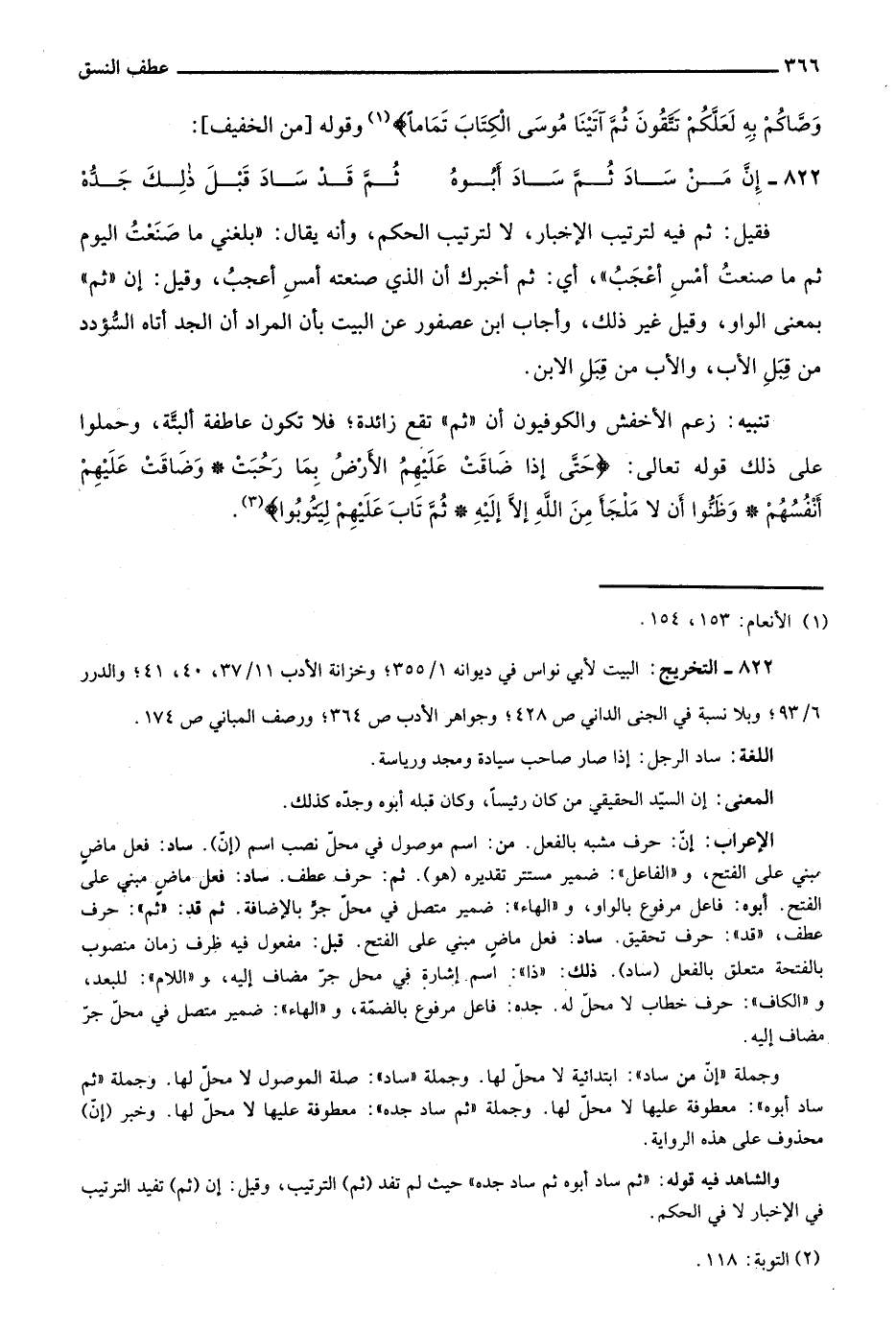 والشاهد فيه قوله: "ثم ساد أبوه ثم ساد جده" حيث لم تفد "ثم" الترتيب، وقيل: إن "ثم" تفيد الترتيب في الإخبار لا في الحكم.