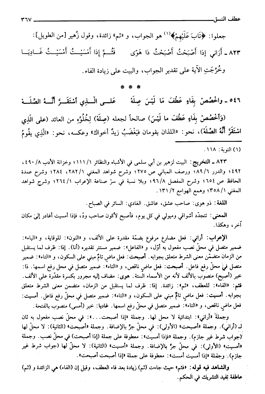الإعراب: أراني: فعل مضارع مرفوع بضمة مقدرة على الألف، و"النون": للوقاية، و"الياء": ضمير متصل في محل نصب مفعول به أول، و"الفاعل": ضمير مستتر تقديره "أنا". إذا: ظرف لما يستقبل من الزمان متضمن معنى الشرط متعلق بجوابه. أصبحت: فعل ماض تام مبني على السكون، و"التاء": ضمير متصل في محل رفع فاعل. "أصبحت: فعل ماض ناقص، و"التاء": ضمير متصل في محل رفع اسمها. ذا: خبر "أصبح" منصوب بالألف لأنه من الأسماء الستة. هوى: مضاف إليه مجرور بكسرة مقدرة على الألف. فثم: "الفاء": للعطف، "ثم": زائدة. إذا: ظرف لما يستقبل من الزمان، متضمن معنى الشرط متعلق بجوابه. أمسيت: فعل ماض تام مبني على السكون، و"التاء": ضمير متصل في محل رفع فاعل. أمسيت: فعل ماض ناقص، و"التاء": ضمير متصل في محل رفع اسمها. غاديا: خبر "أمسى" منصوب بالفتحة.