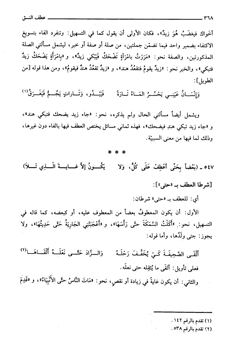 الأول: أن يكون المعطوف بعضًا من المعطوف عليه، أو كبعضه، كما قاله في التسهيل، نحو: "أكلت السمكةَ حتى رأسَها"، و"أعجبتني الجاريةُ حتى حديثُها"، ولا يجوز: حتى ولدها، وأما قوله: