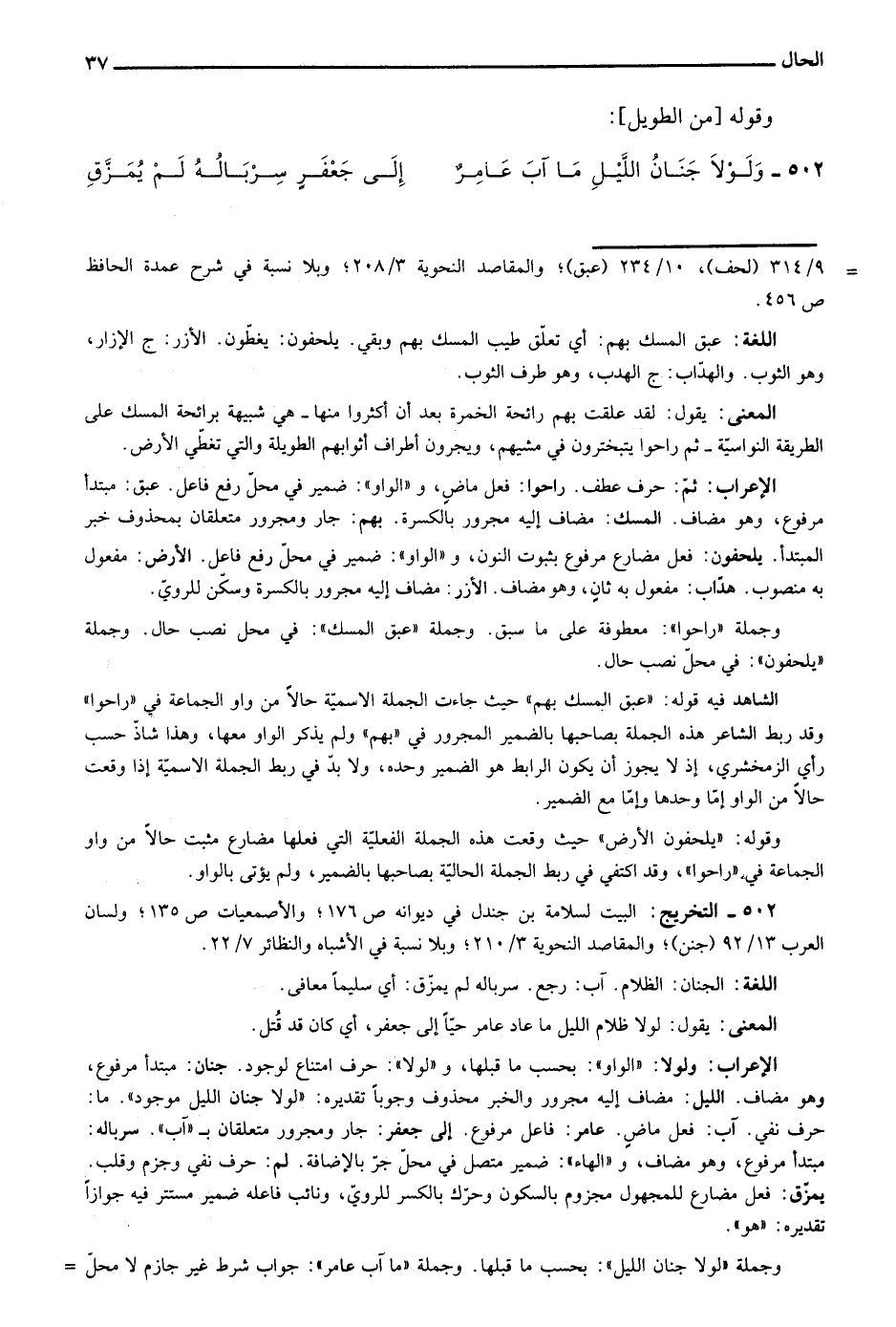 الإعراب: ولولا: "الواو": بحسب ما قبلها، و"لولا": حرف امتناع لوجود. جنان: مبتدأ مرفوع، وهو مضاف. الليل: مضاف إليه مجرور والخبر محذوف وجوبا تقديره: "لولا جنان الليل موجود". ما: حرف نفي. آب: فعل ماض. عامر: فاعل مرفوع. إلى جعفر: جار ومجرور متعلقان بـ"آب". سرباله: مبتدأ مرفوع، وهو مضاف، و"الهاء": ضمير متصل في محل جر بالإضافة. لم: حرف نفي وجزم وقلب. يمزق: فعل مضارع للمجهول مجزوم بالسكون وحرك بالكسر للروي، ونائب فاعله ضمير مستتر فيه جوازا تقديره: "هو".
