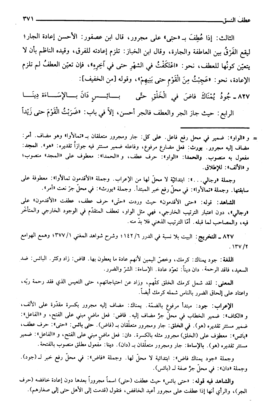 الشاهد: قوله: "حتى الأقدمون" حيث وردت "حتى" حرف عطف، عطفت "الأقدمون" على "رجالي"، دون اعتبار الترتيب الخارجي، فهي مثل الواو، تعطف المتقدم في الوجود الخارجي والمتأخر فيه، والمصاحب لما قبله. أما الترتيب الذهني فلا بد منه.