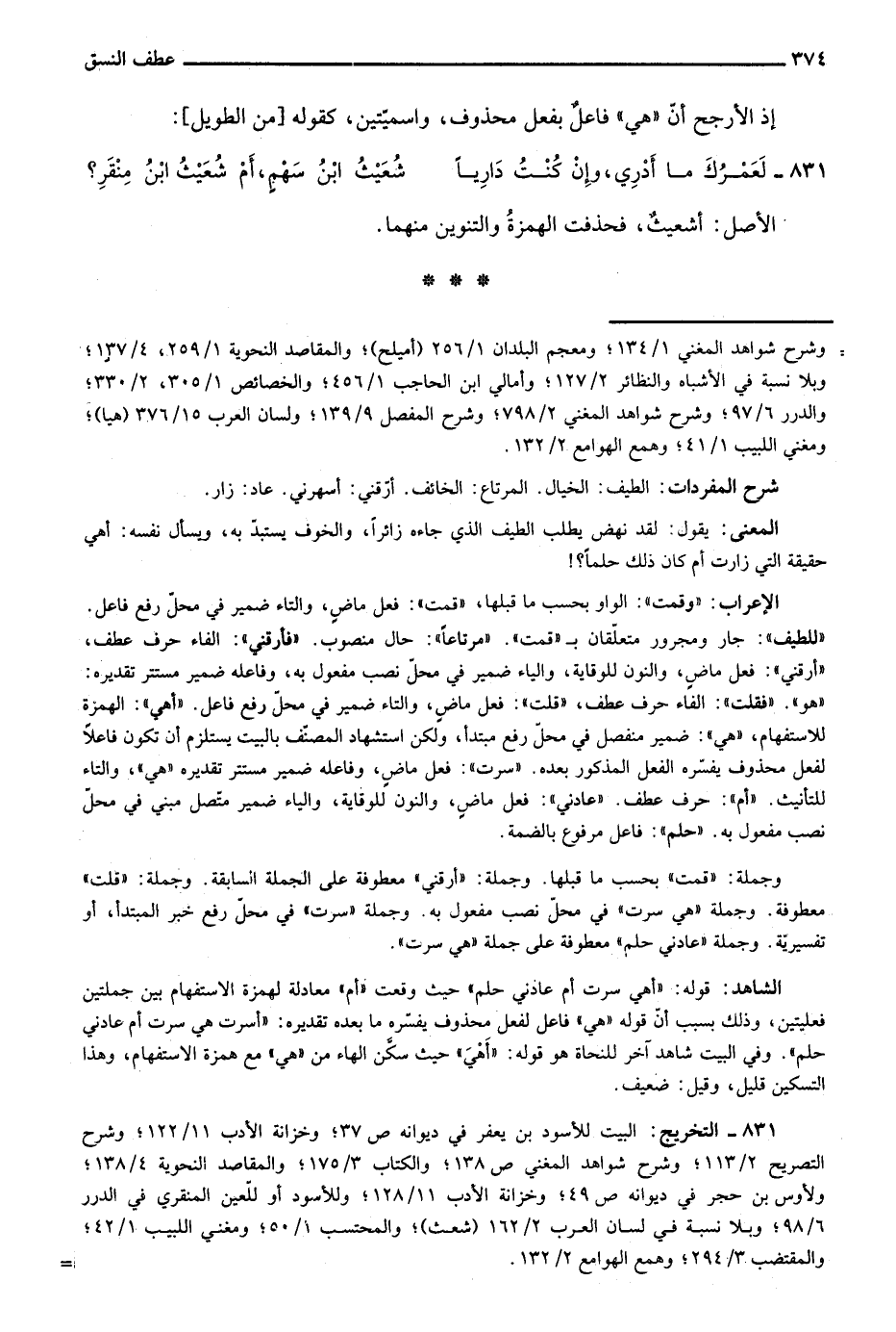 الشاهد: قوله: "أهي سرت أم عادني حلم" حيث وقعت "أم" معادلة لهمزة الاستفهام بين جملتين فعليتين، وذلك بسبب أن قوله: "هي" فاعل لفعل محذوف يفسره ما بعده تقديره: "أسرت هي سرت أم عادني حلم". وفي البيت شاهد آخر للنحاة هو قوله: "أهي" حيث سكن الهاء من "هي" مع همزة الاستفهام، وهذا التسكين قليل، وقيل: ضعيف.