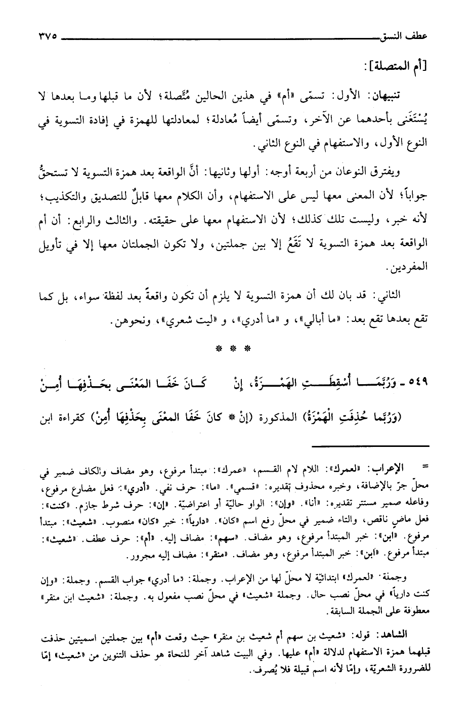 الشاهد: قوله: "شعيث بن سهم أم شعيث بن منقر" حيث وقعت "أم" بين جملتين اسميتين حذفت قبلهما همزة الاستفهام لدلالة "أم" عليها. وفي البيت شاهد آخر للنحاة هو حذف التنوين من "شعيث" إما للضرورة الشعرية، وإما لأنه اسم قبيلة فلا يُصرف.
