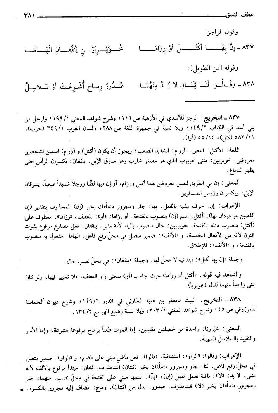 837- التخريج: الرجز للأسدي في الأزهية ص116؛ وشرح شواهد المغني 1/ 199؛ ولرجل من بني أسد في الكتاب 2/ 149؛ وبلا نسبة في جمهرة اللغة ص288؛ ولسان العرب 1/ 349 "حزب"، 11/ 582 "كتل"، 14/ 55 "أوا".