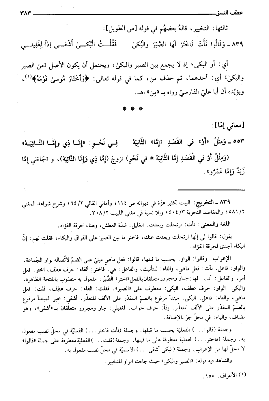 والشاهد فيه قوله: "الصبر والبكى": حيث جاءت الواو للتخيير.