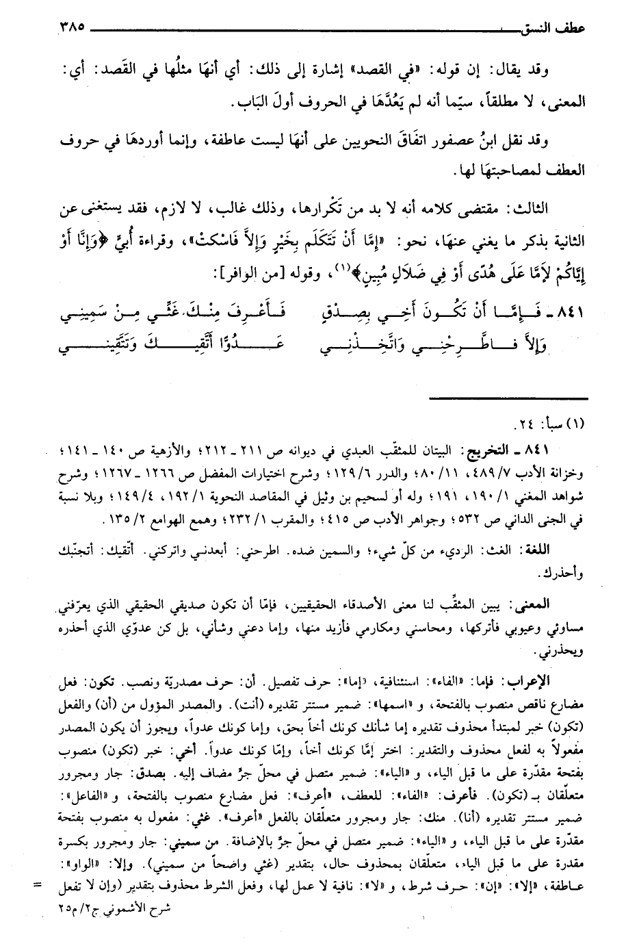 الإعراب: فإما: "الفاء": استئنافية، "إما": حرف تفصيل. أن: حرف مصدرية ونصب. تكون: فعل مضارع ناقص منصوب بالفتحة. و"اسمها": ضمير مستتر تقديره "أنت". والمصدر المؤول من "أن" والفعل "تكون" خبر لمبتدأ محذوف تقديره إما شأنك كونك أخًا بحق، وإما كونك عدوًّا، ويجوز أن يكون المصدر مفعولًا به لفعل محذوف والتقدير: اختر إما كونك أخًا، وإما كونك عدوًّا. أخي: خبر "تكون" منصوب بفتحة مقدرة على ما قبل الياء، و"الياء": ضمير متصل في محل جر مضاف إليه. بصدق: جار ومجرور متعلقان بـ"تكون". فأعرف: "الفاء": للعطف، "أعرف": فعل مضارع منصوب بالفتحة. و"الفاعل": ضمير مستتر تقديره "أنا" منك: جار ومجرور متعلقان بالفعل "أعرف". غثي: مفعول به منصوب بفتحة مقدرة على ما قبل الياء، و"الياء": ضمير متصل في محل جر بالإضافة. من سميني: جار ومجرور بكسرة مقدرة على ما قبل "الياء، متعلقان بمحذوف حال، بتقدير "غثي واضحًا من سميني". وإلا: "الواو": عاطفة، "إلا": "إن" حرف شرط، و"لا": نافية لا عمل لها، وفعل الشرط محذوف بتقدير "وإن لا تفعل =