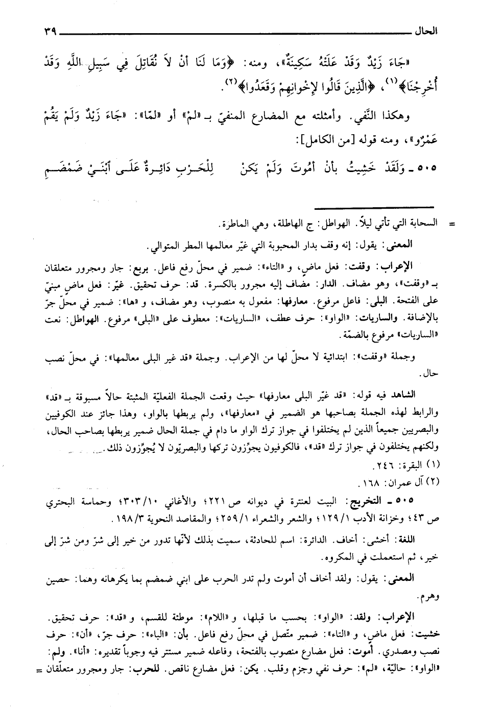 الشاهد فيه قوله: "قد غير البلى معارفها" حيث وقعت الجملة الفعلية المثبتة حالا مسبوقة بـ"قد" والرابط لهذه الجملة بصاحبها هو الضمير في "معارفها"، ولم يربطها بالواو، وهذا جائز عند الكوفيين والبصريين جميعا الذين لم يختلفوا في جواز ترك الواو ما دام في جملة الحال ضمير يربطها بصاحب الحال، ولكنهم يختلفون في جواز ترك "قد"، فالكوفيون يجوزون تركها والبصريون لا يجوزون ذلك.